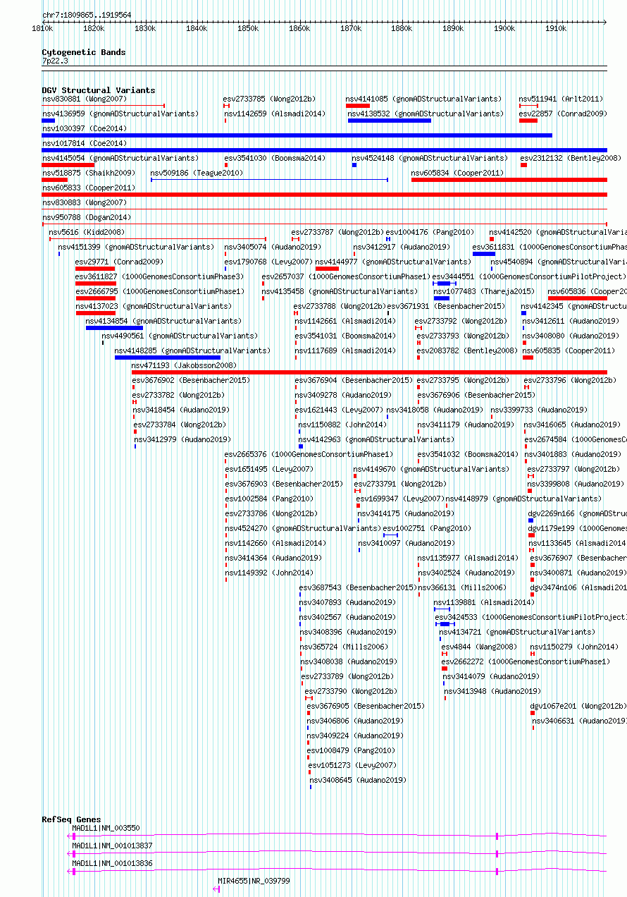 | | Variant Type | CNV deletion | | Copy Number | | | Allele State | | | Allele Origin | | | Probe Count | | | Validation Flag | | | Merged Status | M | | Merged Variants | | | Supporting Variants | nssv2997592 | | Samples | BILGI_BIOE | | Known Genes | MAD1L1, MIR4655 | | Method | Sequencing | | Analysis | | | Platform | Illumina HiSeq 2000 | | Comments | | | Reference | Dogan_et_al_2014 | | Pubmed ID | 24416366 | | Accession Number(s) | nsv950788