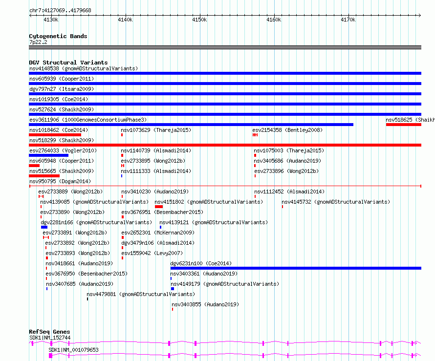 | Variant Type | CNV deletion | Copy Number | | Allele State | | Allele Origin | | Probe Count | | Validation Flag | | Merged Status | M | Merged Variants | | Supporting Variants | nssv2997599 | Samples | BILGI_BIOE | Known Genes | SDK1 | Method | Sequencing | Analysis | | Platform | Illumina HiSeq 2000 | Comments | | Reference | Dogan_et_al_2014 | Pubmed ID | 24416366 | Accession Number(s) | nsv950795