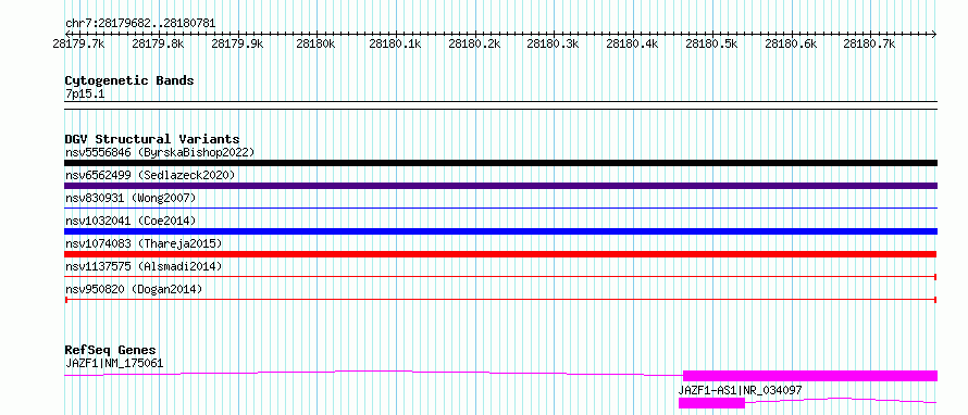 Variant DetailsVariant: nsv950820| Internal ID | 17299694 | | Landmark | | | Location Information | | | Cytoband | 7p15.1 | | Allele length | | Assembly | Allele length | | hg38 | 1100 | | hg19 | 1100 |