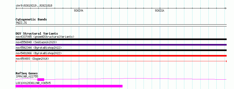 Variant DetailsVariant: nsv950893| Internal ID | 17299767 | | Landmark | | | Location Information | | | Cytoband | 9q22.31 | | Allele length | | Assembly | Allele length | | hg38 | 2600 | | hg19 | 2600 |