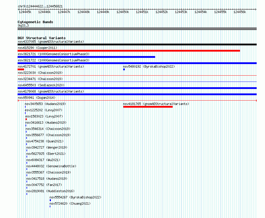 Variant DetailsVariant: nsv950941| Internal ID | 17299815 | | Landmark | | | Location Information | | | Cytoband | 9q33.3 | | Allele length | | Assembly | Allele length | | hg38 | 12200 | | hg19 | 12200 |