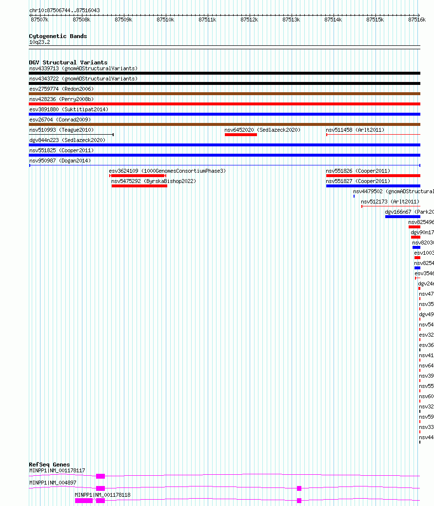 Variant DetailsVariant: nsv950987| Internal ID | 17299861 | | Landmark | | | Location Information | | | Cytoband | 10q23.2 | | Allele length | | Assembly | Allele length | | hg38 | 9300 | | hg19 | 9300 |