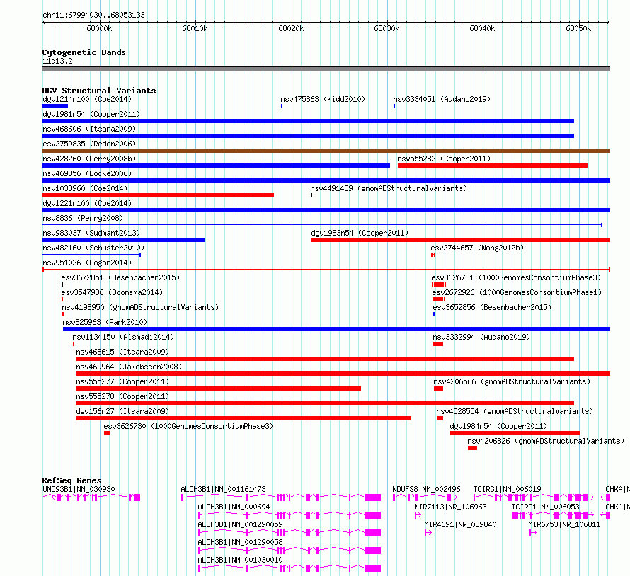 Variant DetailsVariant: nsv951026| Internal ID | 16953213 | | Landmark | | | Location Information | | | Cytoband | 11q13.2 | | Allele length | | Assembly | Allele length | | hg38 | 59104 | | hg19 | 59100 |