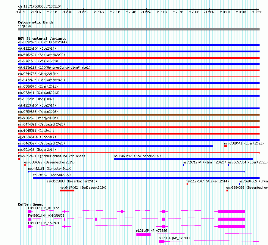 Variant DetailsVariant: nsv951036| Internal ID | 17299910 | | Landmark | | | Location Information | | | Cytoband | 11q13.4 | | Allele length | | Assembly | Allele length | | hg38 | 15300 | | hg19 | 15300 |