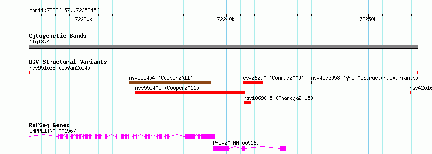 | Variant Type | CNV deletion | Copy Number | | Allele State | | Allele Origin | | Probe Count | | Validation Flag | | Merged Status | M | Merged Variants | | Supporting Variants | nssv2999585 | Samples | BILGI_BIOE | Known Genes | INPPL1, PHOX2A | Method | Sequencing | Analysis | | Platform | Illumina HiSeq 2000 | Comments | | Reference | Dogan_et_al_2014 | Pubmed ID | 24416366 | Accession Number(s) | nsv951038