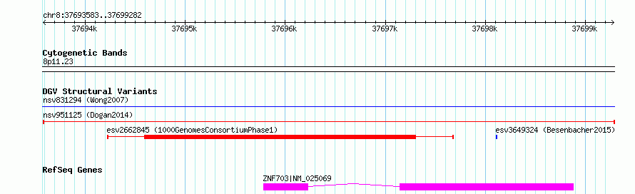 | | Variant Type | CNV deletion | | Copy Number | | | Allele State | | | Allele Origin | | | Probe Count | | | Validation Flag | | | Merged Status | M | | Merged Variants | | | Supporting Variants | nssv2999251 | | Samples | BILGI_BIOE | | Known Genes | ZNF703 | | Method | Sequencing | | Analysis | | | Platform | Illumina HiSeq 2000 | | Comments | | | Reference | Dogan_et_al_2014 | | Pubmed ID | 24416366 | | Accession Number(s) | nsv951125