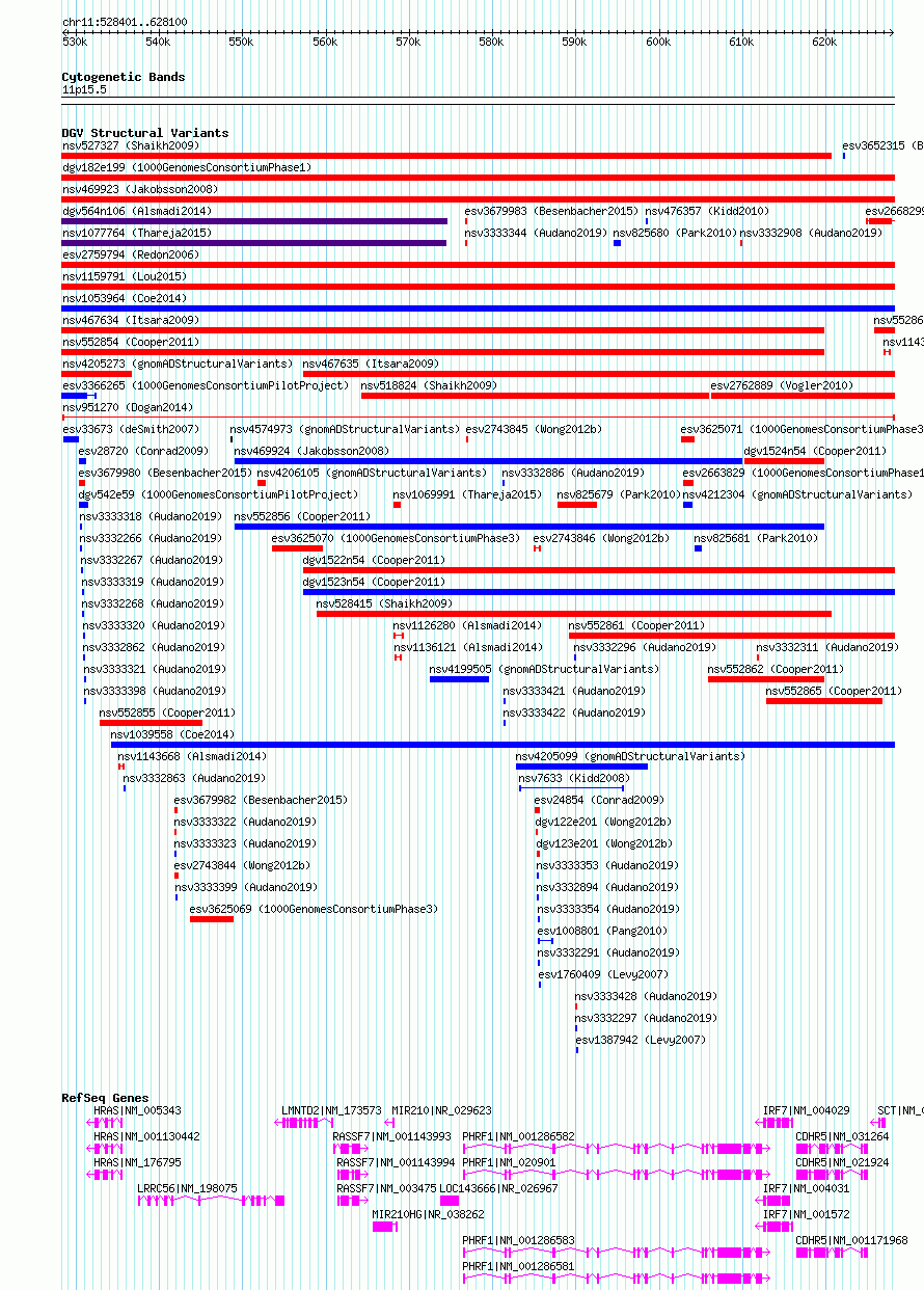 Variant DetailsVariant: nsv951270| Internal ID | 16953457 | | Landmark | | | Location Information | | | Cytoband | 11p15.5 | | Allele length | | Assembly | Allele length | | hg38 | 99700 | | hg19 | 99700 |