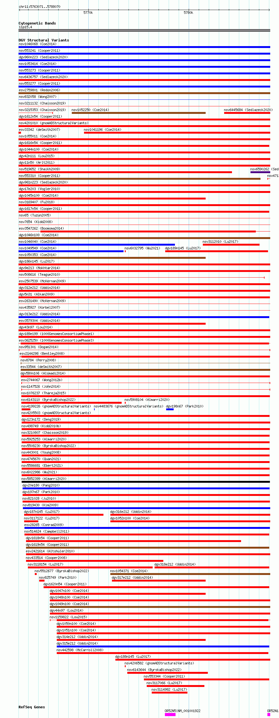 Variant DetailsVariant: nsv951301| Internal ID | 17300175 | | Landmark | | | Location Information | | | Cytoband | 11p15.4 | | Allele length | | Assembly | Allele length | | hg38 | 25000 | | hg19 | 25000 |