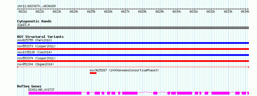 Variant DetailsVariant: nsv951304| Internal ID | 16953491 | | Landmark | | | Location Information | | | Cytoband | 11p15.4 | | Allele length | | Assembly | Allele length | | hg38 | 13500 | | hg19 | 13500 |