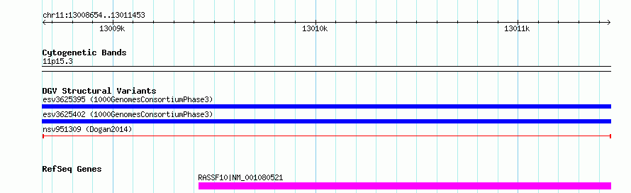 Variant DetailsVariant: nsv951309| Internal ID | 16953496 | | Landmark | | | Location Information | | | Cytoband | 11p15.2 | | Allele length | | Assembly | Allele length | | hg38 | 2800 | | hg19 | 2800 |