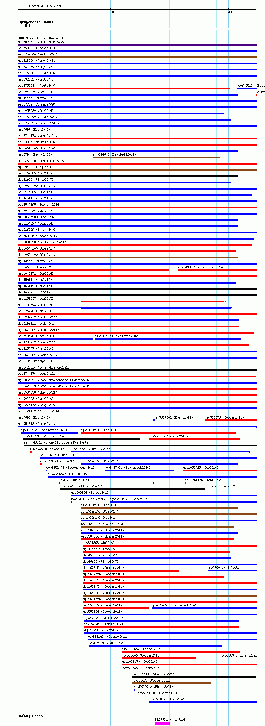 Variant DetailsVariant: nsv951318| Internal ID | 17300192 | | Landmark | | | Location Information | | | Cytoband | 11p15.1 | | Allele length | | Assembly | Allele length | | hg38 | 20200 | | hg19 | 20200 |