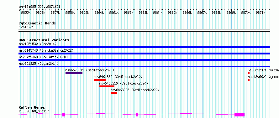 Variant DetailsVariant: nsv951325| Internal ID | 17300199 | | Landmark | | | Location Information | | | Cytoband | 12p13.31 | | Allele length | | Assembly | Allele length | | hg38 | 17100 | | hg19 | 17100 |