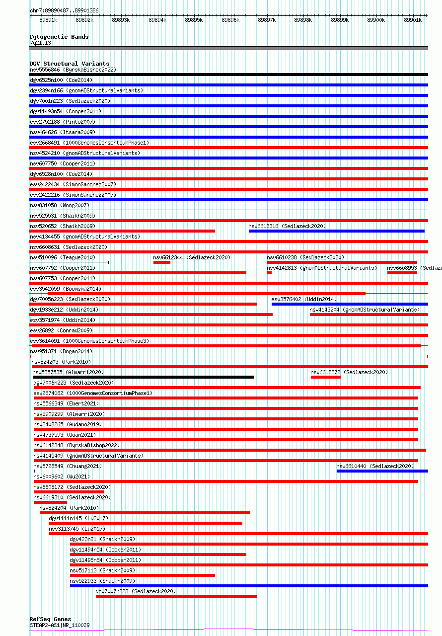 Variant DetailsVariant: nsv951371| Internal ID | 17300245 | | Landmark | | | Location Information | | | Cytoband | 7q21.13 | | Allele length | | Assembly | Allele length | | hg38 | 10900 | | hg19 | 10900 |