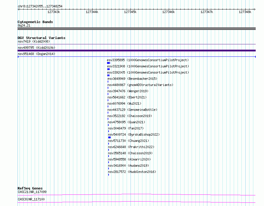 Variant DetailsVariant: nsv951468| Internal ID | 17300342 | | Landmark | | | Location Information | | | Cytoband | 8q24.21 | | Allele length | | Assembly | Allele length | | hg38 | 6200 | | hg19 | 6200 |