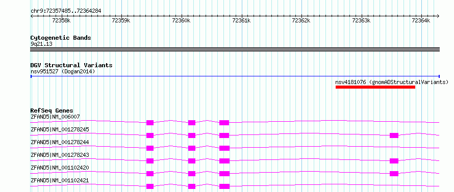 Variant DetailsVariant: nsv951527| Internal ID | 17300401 | | Landmark | | | Location Information | | | Cytoband | 9q21.13 | | Allele length | | Assembly | Allele length | | hg38 | 6800 | | hg19 | 6800 |