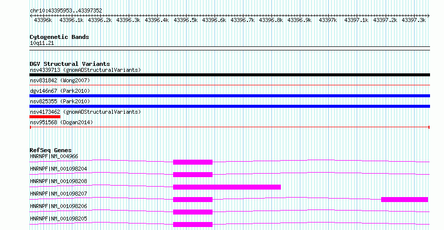 Variant DetailsVariant: nsv951568| Internal ID | 17300442 | | Landmark | | | Location Information | | | Cytoband | 10q11.21 | | Allele length | | Assembly | Allele length | | hg38 | 1400 | | hg19 | 1400 |