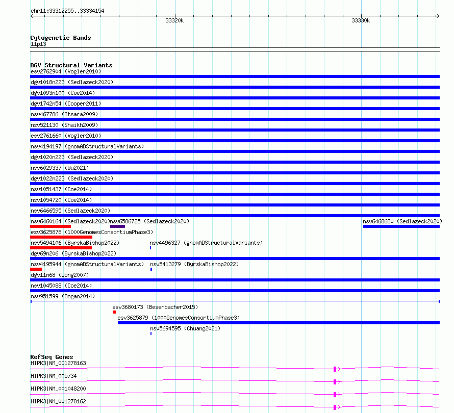 Variant DetailsVariant: nsv951599| Internal ID | 17300473 | | Landmark | | | Location Information | | | Cytoband | 11p13 | | Allele length | | Assembly | Allele length | | hg38 | 21900 | | hg19 | 21900 |