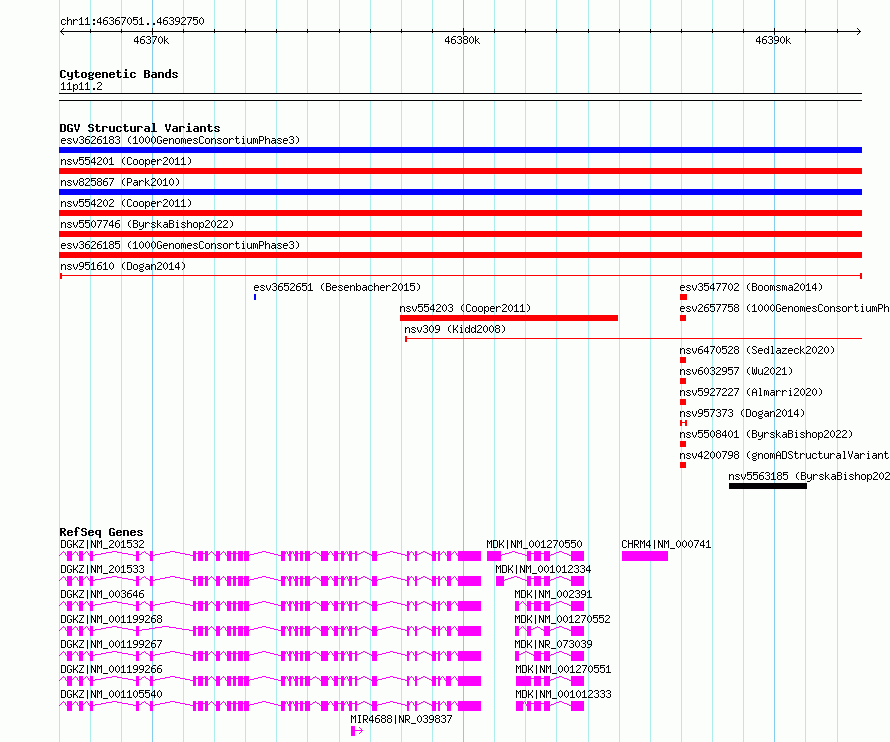 Variant DetailsVariant: nsv951610| Internal ID | 17300484 | | Landmark | | | Location Information | | | Cytoband | 11p11.2 | | Allele length | | Assembly | Allele length | | hg38 | 25700 | | hg19 | 25700 |