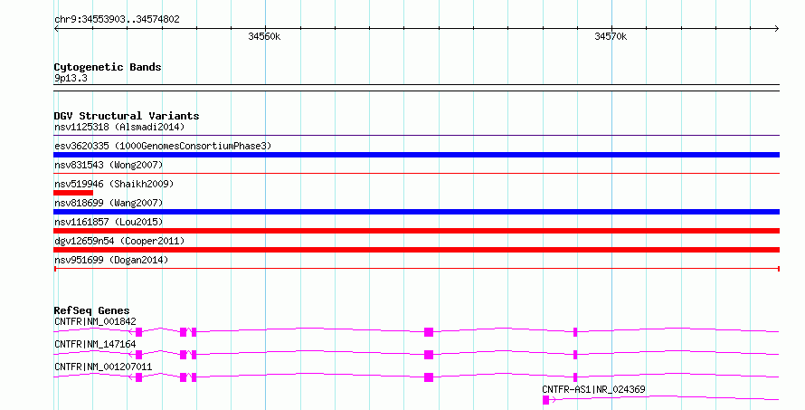 | Variant Type | CNV deletion | Copy Number | | Allele State | | Allele Origin | | Probe Count | | Validation Flag | | Merged Status | M | Merged Variants | | Supporting Variants | nssv2999388 | Samples | BILGI_BIOE | Known Genes | CNTFR, CNTFR-AS1 | Method | Sequencing | Analysis | | Platform | Illumina HiSeq 2000 | Comments | | Reference | Dogan_et_al_2014 | Pubmed ID | 24416366 | Accession Number(s) | nsv951699