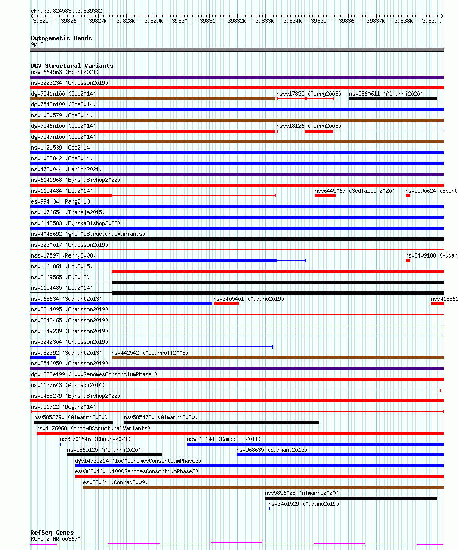Variant DetailsVariant: nsv951722| Internal ID | 17300596 | | Landmark | | | Location Information | | | Cytoband | 9p12 | | Allele length | | Assembly | Allele length | | hg38 | 14800 | | hg19 | 14800 |