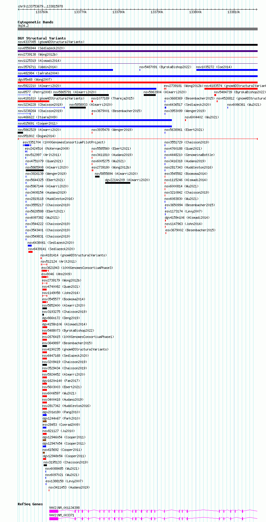 Variant DetailsVariant: nsv951802| Internal ID | 17300676 | | Landmark | | | Location Information | | | Cytoband | 9q34.2 | | Allele length | | Assembly | Allele length | | hg38 | 62300 | | hg19 | 62300 |