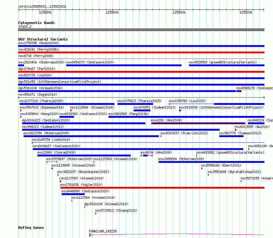 Variant DetailsVariant: nsv951871| Internal ID | 17300745 | | Landmark | | | Location Information | | | Cytoband | 10q26.2 | | Allele length | | Assembly | Allele length | | hg38 | 36700 | | hg19 | 36700 |