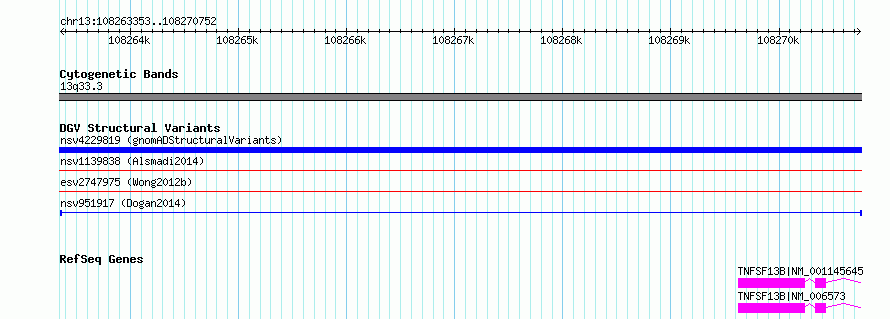 Variant DetailsVariant: nsv951917| Internal ID | 16954104 | | Landmark | | | Location Information | | | Cytoband | 13q33.3 | | Allele length | | Assembly | Allele length | | hg38 | 7400 | | hg19 | 7400 |