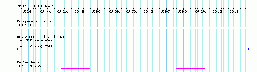 | Variant Type | CNV duplication | Copy Number | | Allele State | | Allele Origin | | Probe Count | | Validation Flag | | Merged Status | M | Merged Variants | | Supporting Variants | nssv2999119 | Samples | BILGI_BIOE | Known Genes | MAP2K1 | Method | Sequencing | Analysis | | Platform | Illumina HiSeq 2000 | Comments | | Reference | Dogan_et_al_2014 | Pubmed ID | 24416366 | Accession Number(s) | nsv951979
