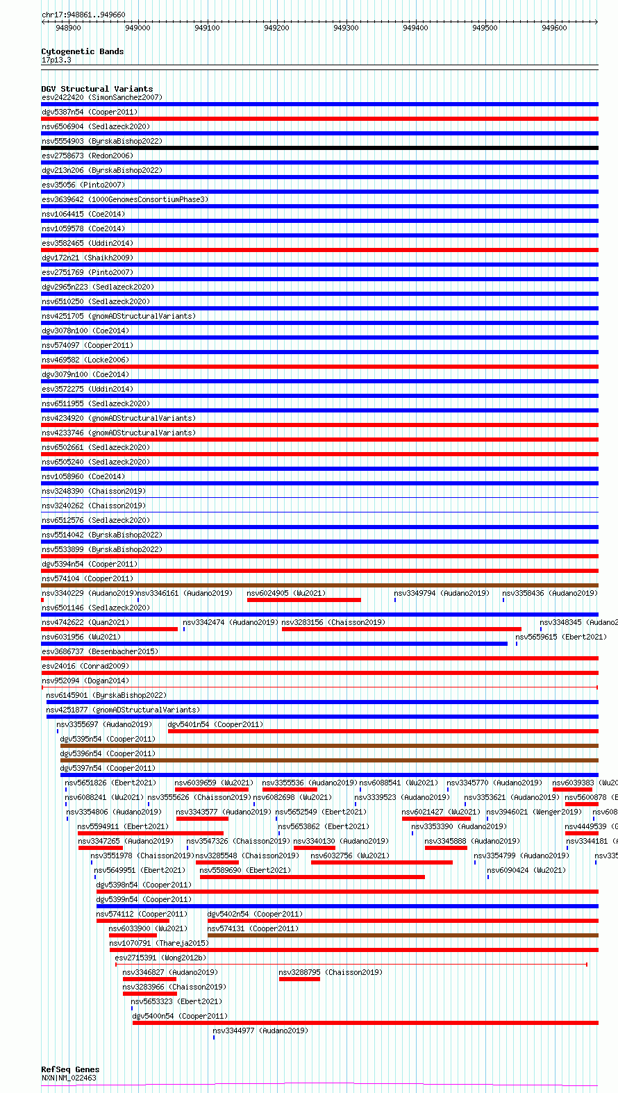 Variant DetailsVariant: nsv952094| Internal ID | 17300968 | | Landmark | | | Location Information | | | Cytoband | 17p13.3 | | Allele length | | Assembly | Allele length | | hg38 | 800 | | hg19 | 800 |