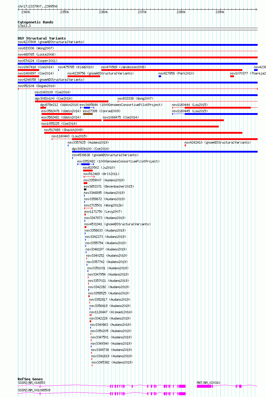 | Variant Type | CNV deletion | Copy Number | | Allele State | | Allele Origin | | Probe Count | | Validation Flag | | Merged Status | M | Merged Variants | | Supporting Variants | nssv3000223 | Samples | BILGI_BIOE | Known Genes | MNT, SGSM2 | Method | Sequencing | Analysis | | Platform | Illumina HiSeq 2000 | Comments | | Reference | Dogan_et_al_2014 | Pubmed ID | 24416366 | Accession Number(s) | nsv952104