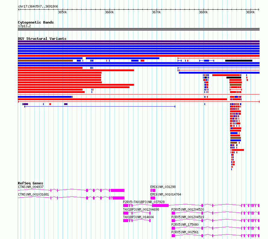 Variant DetailsVariant: nsv952107| Internal ID | 17300981 | | Landmark | | | Location Information | | | Cytoband | 17p13.2 | | Allele length | | Assembly | Allele length | | hg38 | 51300 | | hg19 | 51300 |