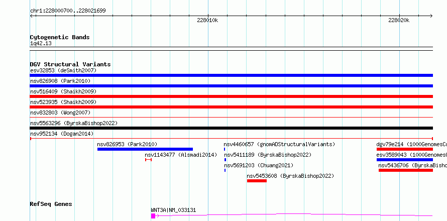 Variant DetailsVariant: nsv952134| Internal ID | 17301008 | | Landmark | | | Location Information | | | Cytoband | 1q42.13 | | Allele length | | Assembly | Allele length | | hg38 | 21000 | | hg19 | 21000 |