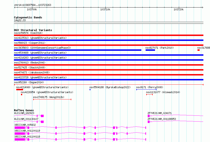 Variant DetailsVariant: nsv952260| Internal ID | 17301134 | | Landmark | | | Location Information | | | Cytoband | 14q32.33 | | Allele length | | Assembly | Allele length | | hg38 | 25700 | | hg19 | 25700 |