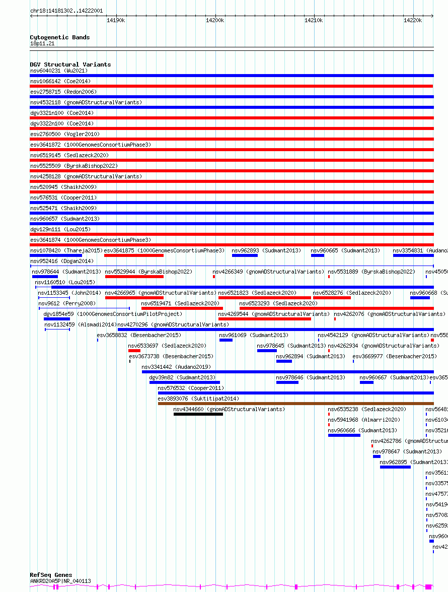 Variant DetailsVariant: nsv952416| Internal ID | 17301290 | | Landmark | | | Location Information | | | Cytoband | 18p11.21 | | Allele length | | Assembly | Allele length | | hg38 | 40700 | | hg19 | 40700 |