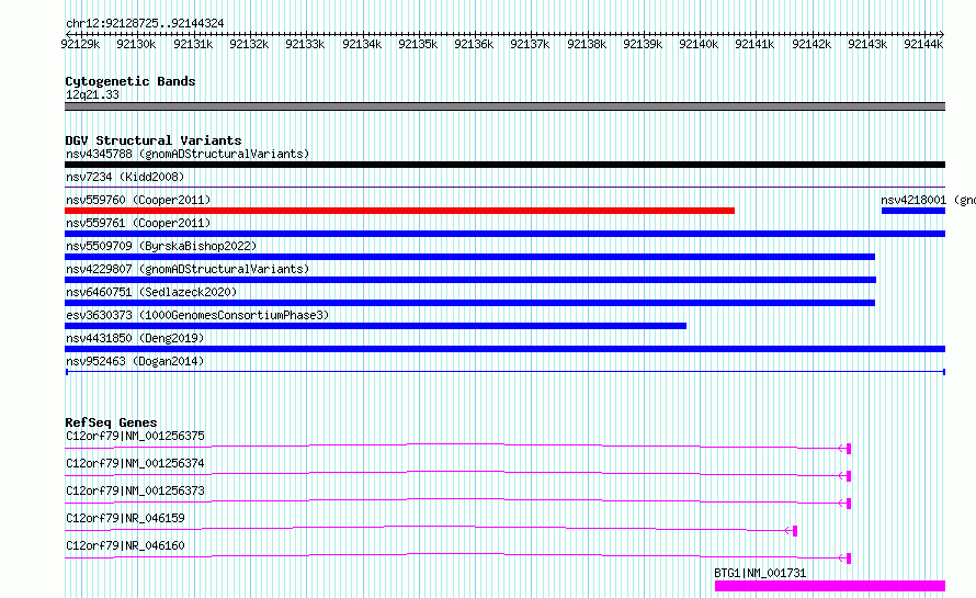 Variant DetailsVariant: nsv952463| Internal ID | 17301337 | | Landmark | | | Location Information | | | Cytoband | 12q21.33 | | Allele length | | Assembly | Allele length | | hg38 | 15600 | | hg19 | 15600 |