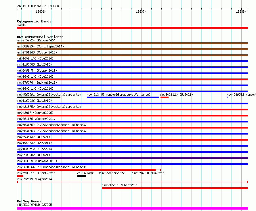 Variant DetailsVariant: nsv952519| Internal ID | 17301393 | | Landmark | | | Location Information | | | Cytoband | 13q11 | | Allele length | | Assembly | Allele length | | hg38 | 2300 | | hg19 | 2300 |