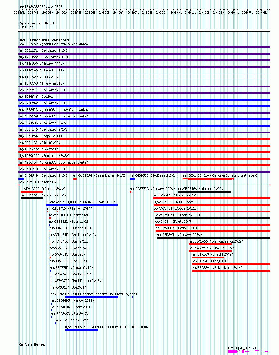 Variant DetailsVariant: nsv952523| Internal ID | 17301397 | | Landmark | | | Location Information | | | Cytoband | 13q12.11 | | Allele length | | Assembly | Allele length | | hg38 | 17600 | | hg19 | 17600 |