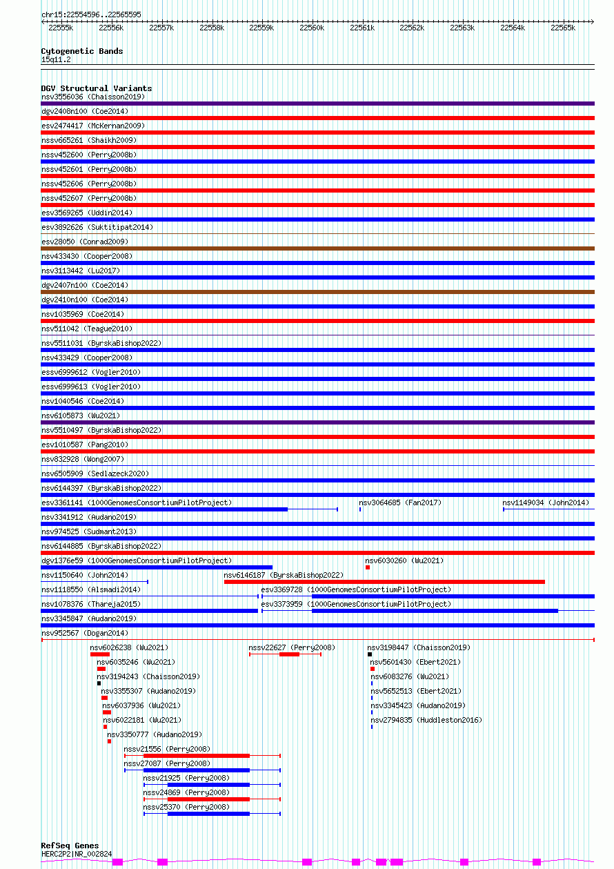 Variant DetailsVariant: nsv952567| Internal ID | 17301441 | | Landmark | | | Location Information | | | Cytoband | 15q11.2 | | Allele length | | Assembly | Allele length | | hg38 | 11000 | | hg19 | 11000 |