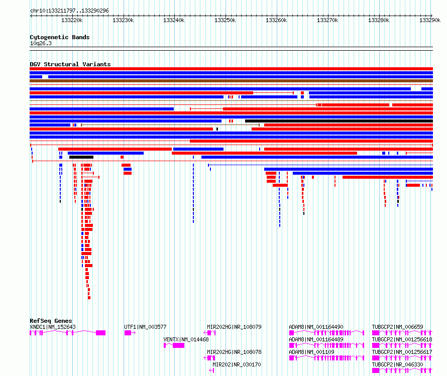 Variant DetailsVariant: nsv952705| Internal ID | 17301579 | | Landmark | | | Location Information | | | Cytoband | 10q26.3 | | Allele length | | Assembly | Allele length | | hg38 | 78500 | | hg19 | 78500 |