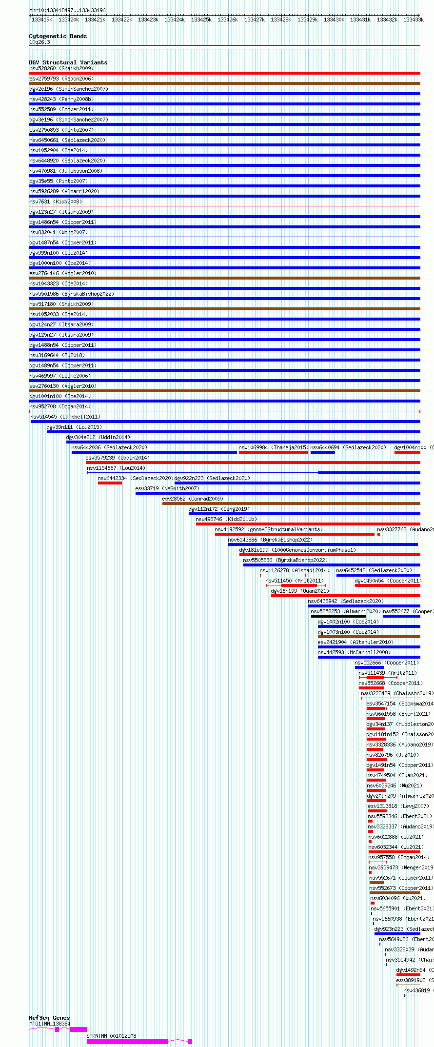 Variant DetailsVariant: nsv952708| Internal ID | 17301582 | | Landmark | | | Location Information | | | Cytoband | 10q26.3 | | Allele length | | Assembly | Allele length | | hg38 | 14700 | | hg19 | 14700 |