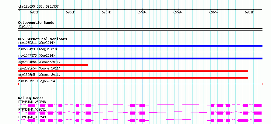 Variant DetailsVariant: nsv952791| Internal ID | 16954978 | | Landmark | | | Location Information | | | Cytoband | 12p13.31 | | Allele length | | Assembly | Allele length | | hg38 | 6800 | | hg19 | 6800 |