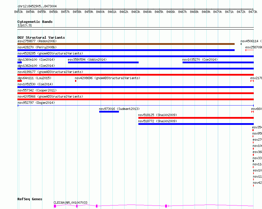 Variant DetailsVariant: nsv952797| Internal ID | 16954984 | | Landmark | | | Location Information | | | Cytoband | 12p13.31 | | Allele length | | Assembly | Allele length | | hg38 | 20100 | | hg19 | 20100 |