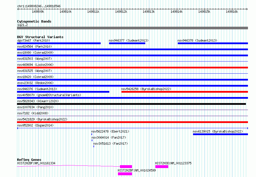 Variant DetailsVariant: nsv952802| Internal ID | 17301676 | | Landmark | | | Location Information | | | Cytoband | 1q21.2 | | Allele length | | Assembly | Allele length | | hg38 | 8301 | | hg19 | 8300 |