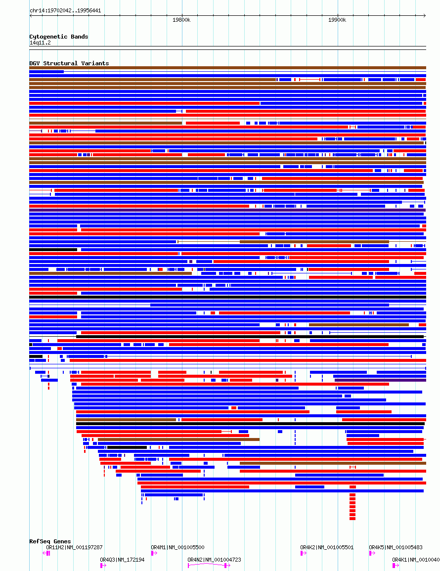 Variant DetailsVariant: nsv952808| Internal ID | 17301682 | | Landmark | | | Location Information | | | Cytoband | 14q11.2 | | Allele length | | Assembly | Allele length | | hg38 | 254400 | | hg19 | 254400 |