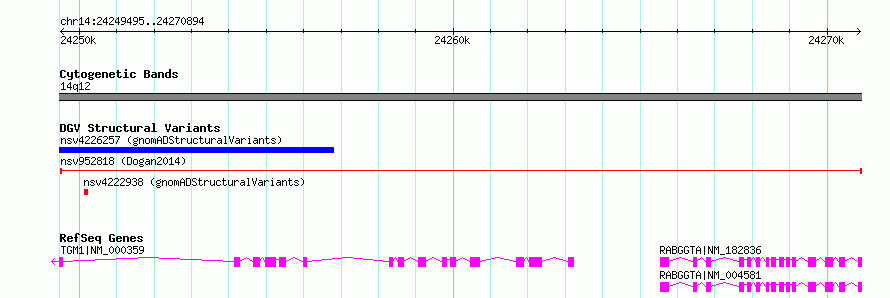 |  | Variant Type | CNV deletion |  | Copy Number |  |  | Allele State |  |  | Allele Origin |  |  | Probe Count |  |  | Validation Flag |  |  | Merged Status | M |  | Merged Variants |  |  | Supporting Variants | nssv2998317 |  | Samples | BILGI_BIOE |  | Known Genes | RABGGTA, TGM1 |  | Method | Sequencing |  | Analysis |  |  | Platform | Illumina HiSeq 2000 |  | Comments |  |  | Reference | Dogan_et_al_2014 |  | Pubmed ID | 24416366 |  | Accession Number(s) | nsv952818