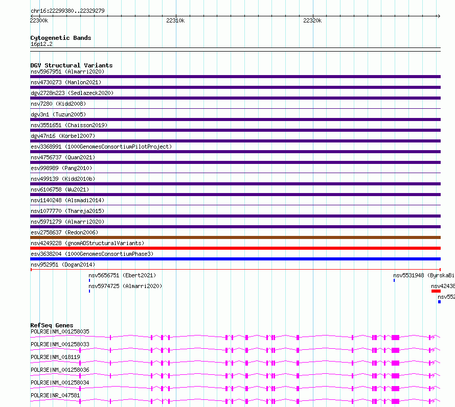 Variant DetailsVariant: nsv952951| Internal ID | 17301825 | | Landmark | | | Location Information | | | Cytoband | 16p12.2 | | Allele length | | Assembly | Allele length | | hg38 | 29900 | | hg19 | 29900 |