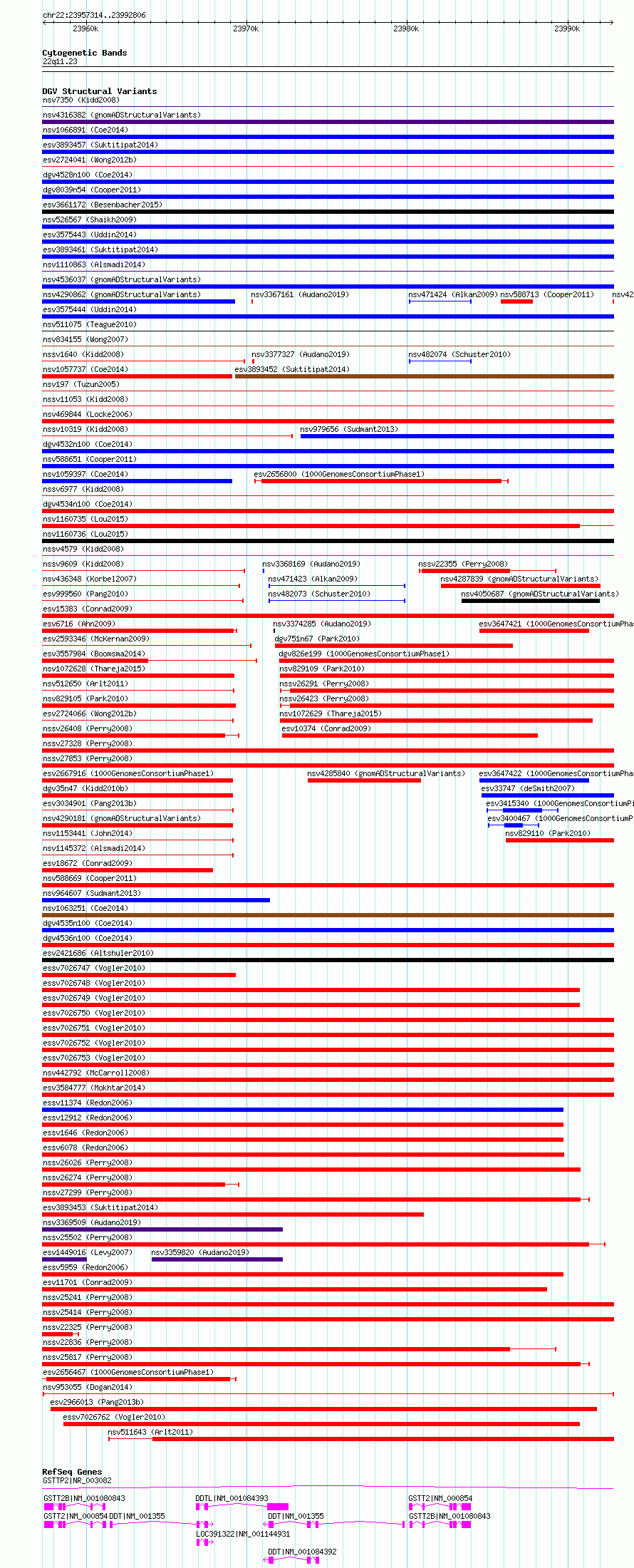 Variant DetailsVariant: nsv953055| Internal ID | 16955242 | | Landmark | | | Location Information | | | Cytoband | 22q11.23 | | Allele length | | Assembly | Allele length | | hg38 | 35493 | | hg19 | 35500 |