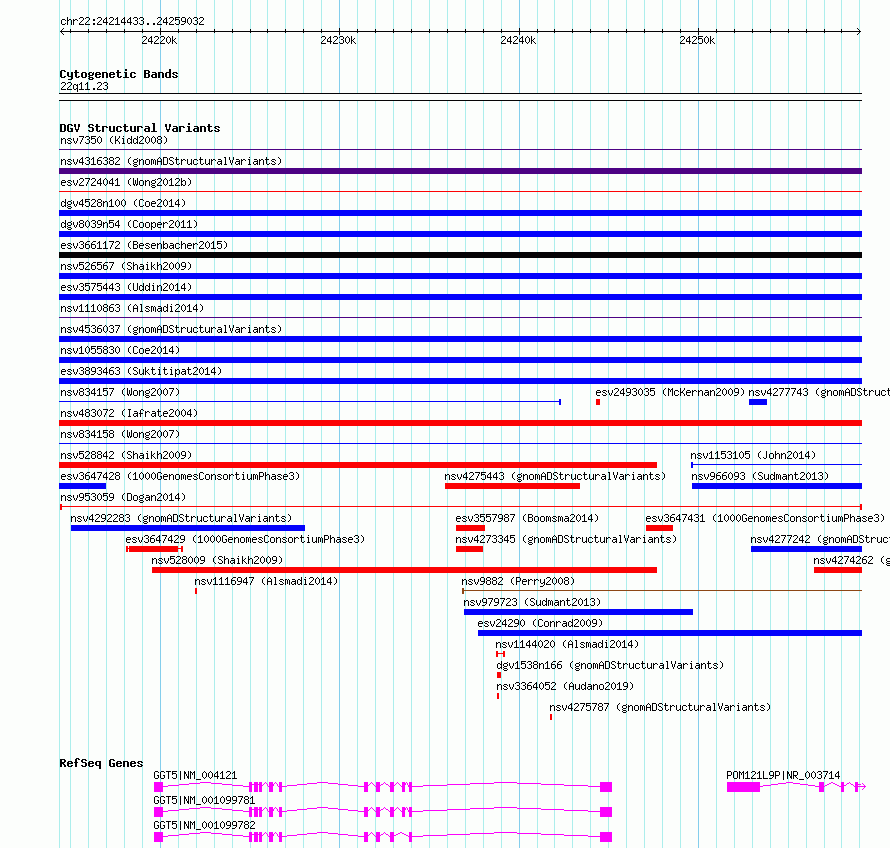 Variant DetailsVariant: nsv953059| Internal ID | 16955246 | | Landmark | | | Location Information | | | Cytoband | 22q11.23 | | Allele length | | Assembly | Allele length | | hg38 | 44600 | | hg19 | 44600 |