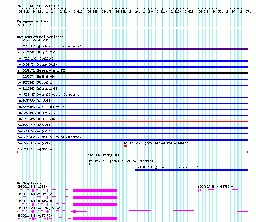 | Variant Type | CNV deletion | Copy Number | | Allele State | | Allele Origin | | Probe Count | | Validation Flag | | Merged Status | M | Merged Variants | | Supporting Variants | nssv3000783 | Samples | BILGI_BIOE | Known Genes | ADORA2A, SPECC1L, SPECC1L-ADORA2A | Method | Sequencing | Analysis | | Platform | Illumina HiSeq 2000 | Comments | | Reference | Dogan_et_al_2014 | Pubmed ID | 24416366 | Accession Number(s) | nsv953061