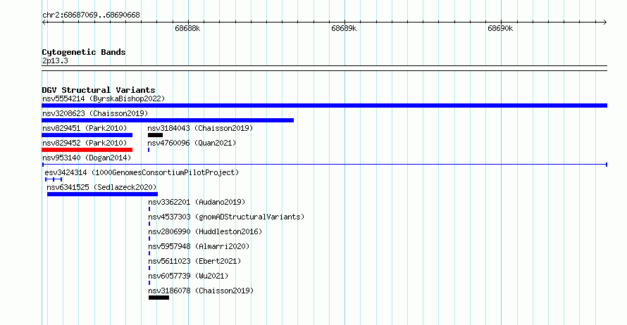 Variant DetailsVariant: nsv953140| Internal ID | 17302014 | | Landmark | | | Location Information | | | Cytoband | 2p13.3 | | Allele length | | Assembly | Allele length | | hg38 | 3600 | | hg19 | 3600 |